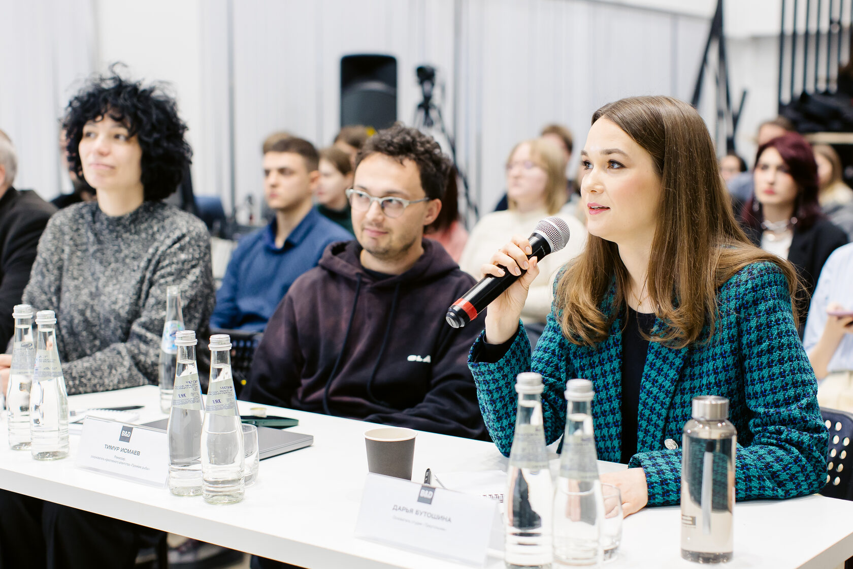 Справа Дарья и далее коллеги из креативных индустрий на портфолио ревью в Институте Бизнеса и Дизайна в ноябре 2023 года